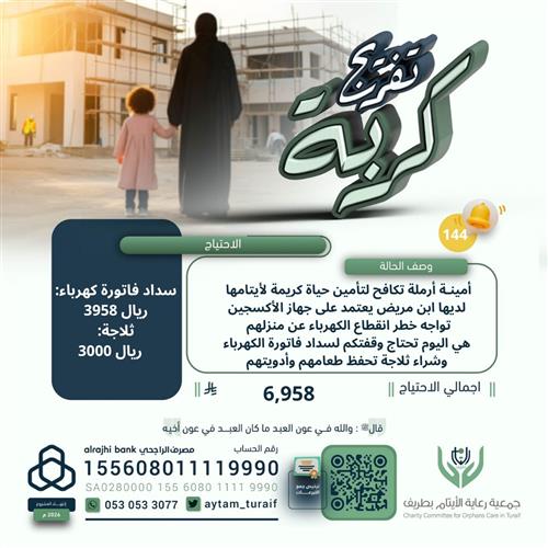 أمينـة أرملة ، تعاني من ضيق الحال والمال لديها ابن مريض ، تناشدكم للوقوف معها وتفريج كربتها وإنقاذهم من خطر تهديد فصل الكهرباء ...